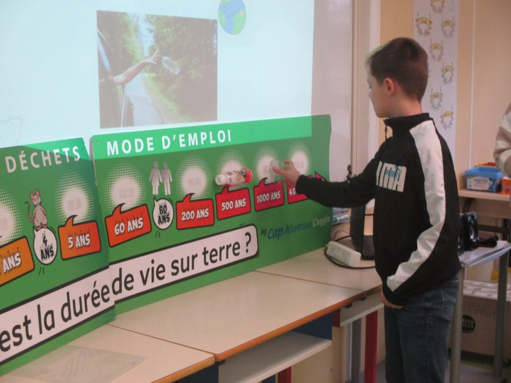 Les élèves de CM2 ont été sensibilisés au tri des déchets par une animatrice de Cap Atlantique. A travers différents ateliers, ils ont réfléchi au choix de la « bonne poubelle ». Des vidéos leur montré l’importance de ce dernier. Ils ont aussi constaté que les déchets jetés dans la nature mettaient beaucoup d’années avant de disparaître !